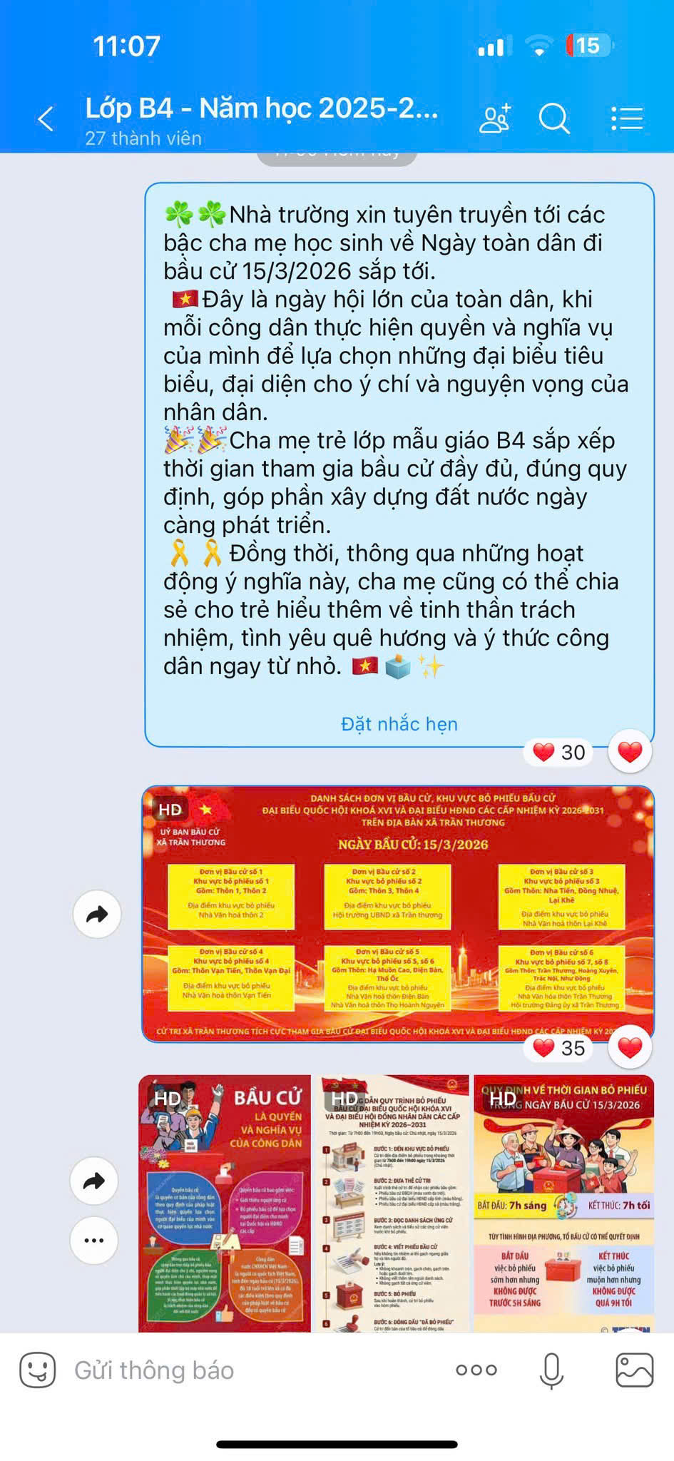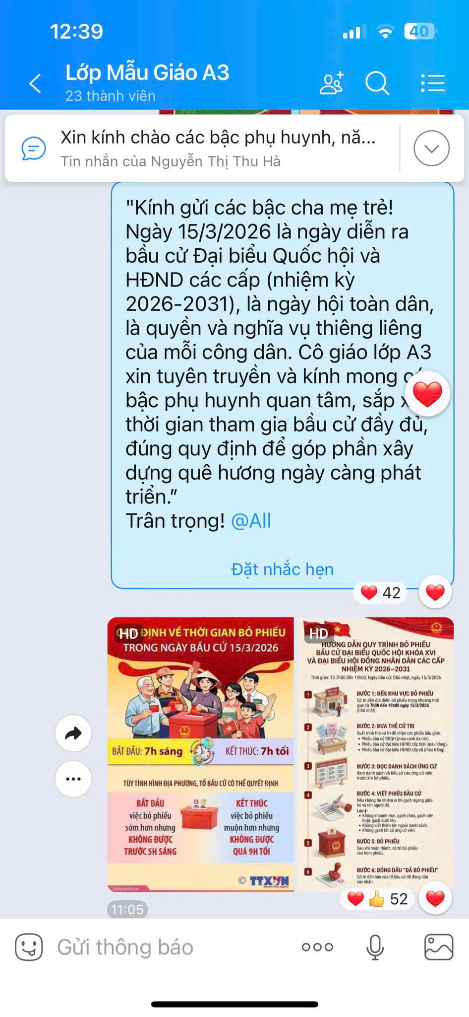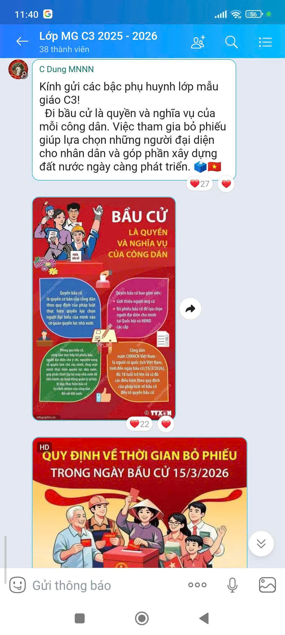 Nhà trường xin trân trọng cảm ơn các bậc cha mẹ và mọi người đã luôn quan tâm, theo dõi và đồng hành cùng các hoạt động tuyên truyền của nhà trường. Dưới đây là hình ảnh tuyên truyền về ngày bầu cử tại 100% các nhóm lớp.