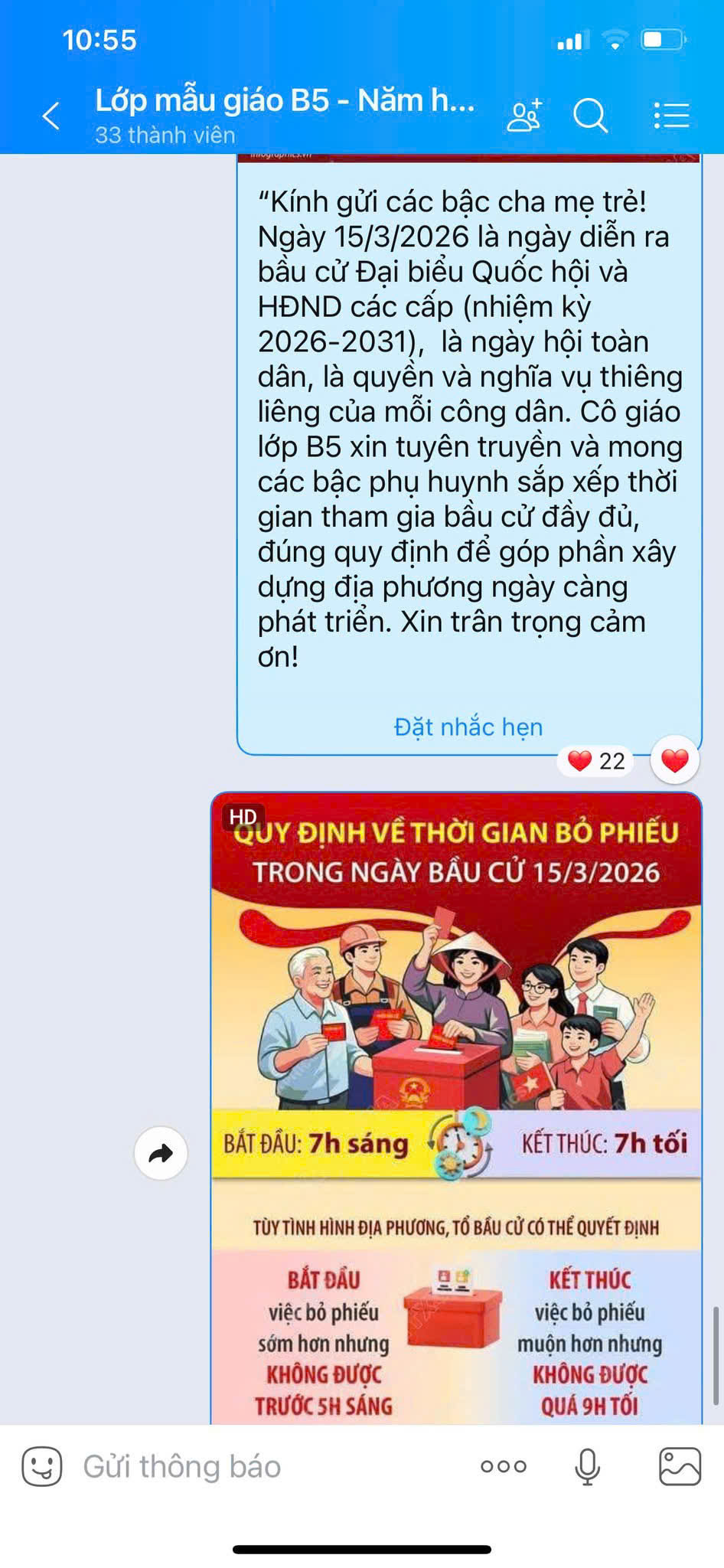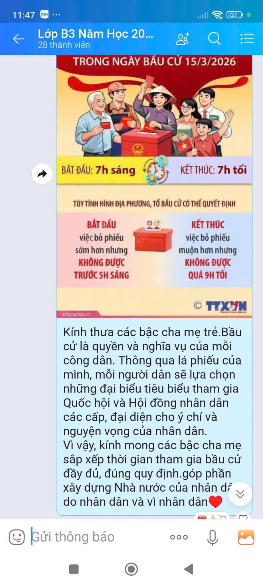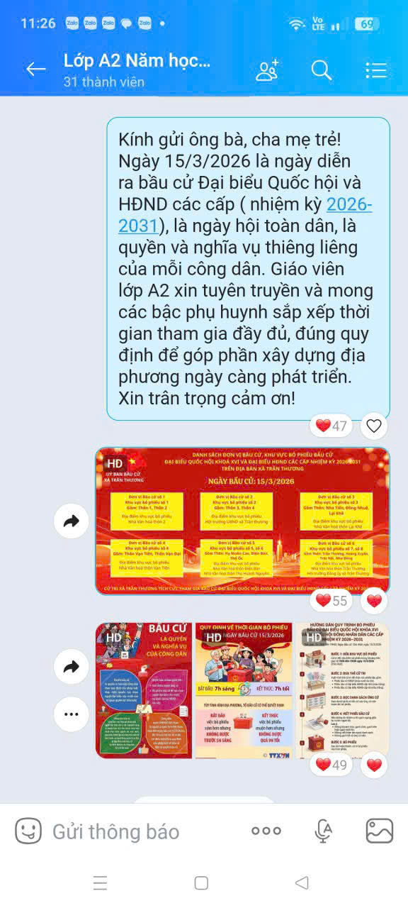 Hoà chung không khí của cả nước phấn khởi, khẩn trương chuẩn bị để chào đón ngày bầu cử, giáo viên trong trường MN Nhân Nghĩa đã tích cực tuyên truyền tới phụ huynh về Ngày bầu cử đại biểu Quốc hội khóa XVI và đại biểu HĐND các cấp nhiệm kỳ 2026 – 2031, được tổ chức vào Chủ nhật, ngày 15/3/2026.