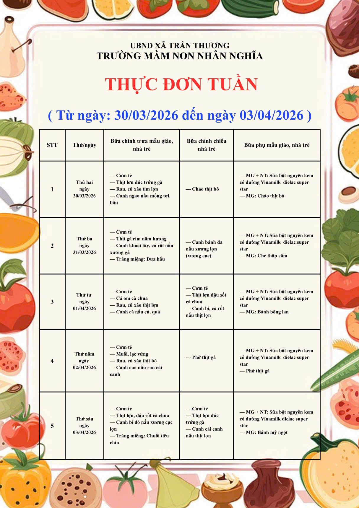 Trường mầm non Nhân Nghĩa công khai thực đơn tuần 1 tháng 4 năm 2026